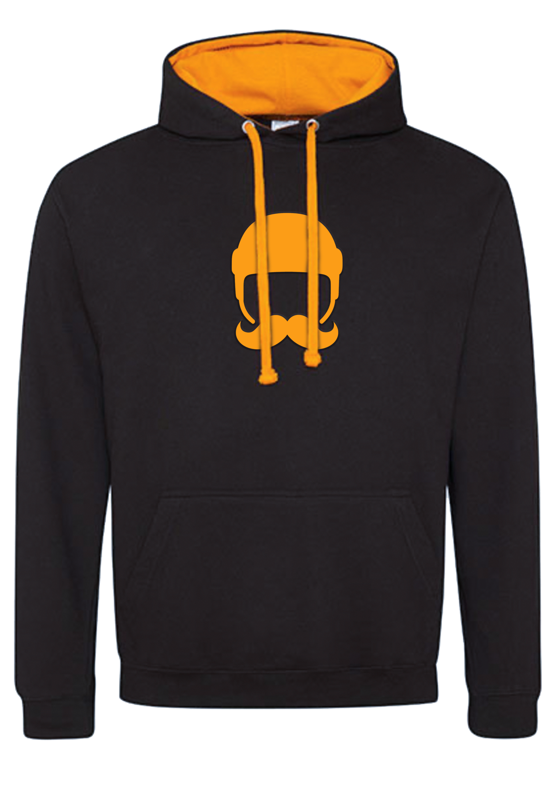 Der schwarze Hoodie mit auffälligen Orange-Details und dem ikonischen Moustache-Helm-Design ist mehr als nur ein Kleidungsstück – er ist ein Statement.